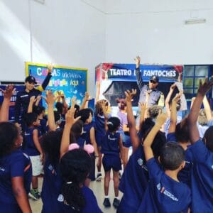 O Grupamento Especial de Ronda Escolar (Gere) de Itaboraí esteve no último dia 11 de setembro no CEMEI Irani Rosa da Silva, no bairro Jardim Itambi. A ação contou com a presença da dupla do teatro de fantoches, Duda e Betinho, que abordaram regras de convivência, além do personagem vivo, o Gm Xandinho, que alegrou a criançada com muita dança.